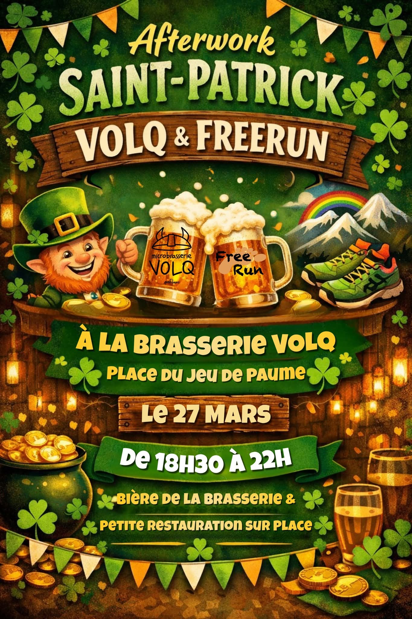 Afterwork de la Saint PatrickVendredi 27 Mars de 18h30 à 22h à la brasserie VOLQ Place du Jeu de Paume à Congenies Bière de la Brasserie, servie par Mathieu Petite Restauration sur Place Ce sera
